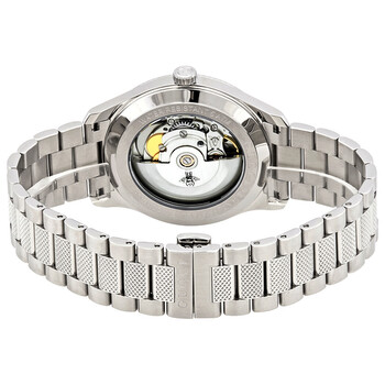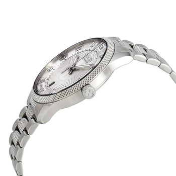 Silver-tone stainless steel case with a silver-tone stainless steel bracelet. Fixed bezel. Silver dial with silver-tone hands and index hour markers. Dial Type: Analog. Date display at the 6 o'clock position. 2824-2 ETA automatic movement. Transparent case back. Round case shape. Case size: 40 mm. Water resistant at 50 meters / 165 feet. Functions: date, hour, minute, second. Watch label: Swiss Made. Gucci Eryx Silver Dial Automatic Men's Watch YA126339.