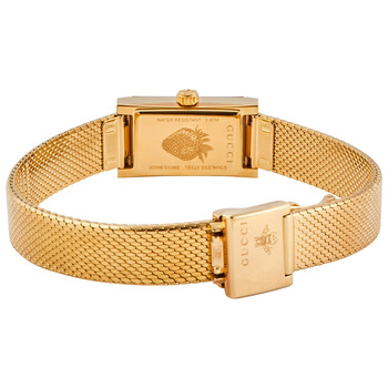 Yellow gold PVD stainless steel case with a yellow gold PVD stainless steel mesh bracelet. Fixed yellow gold PVD bezel. White, red and navy dial with gold-tone alpha-style hands. Pyramids mark the 3, 6, 9 and 12 o'clock positions. Dial Type: Analog. Quartz movement. Scratch resistant sapphire crystal. Pull / push crown. Solid case back. Rectangle case shape. Case dimensions: 14 mm x 25 mm. Band width: 10 mm. Fold over slip through clasp. Water resistant at 30 meters / 100 feet. Functions: hour, minute. G-frame Series. Dress watch style. Watch label: Swiss Made. Gucci G-Frame Quartz White, Red and Navy Dial Ladies Watch YA147511.