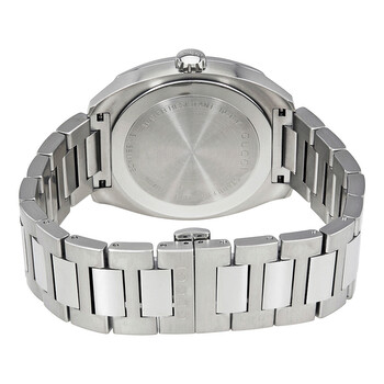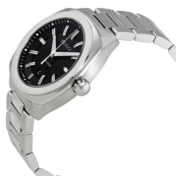 Stainless steel case with a stainless steel bracelet. Fixed stainless steel bezel. Black dial with luminous silver-tone hands and index hour markers. Minute markers around the outer rim. Dial Type: Analog. Luminescent hands and markers. Date display at the 6 o'clock position. Quartz movement. Scratch resistant mineral crystal. Screw down crown. Solid case back. Case size: 40 mm. Case thickness: 8 mm. Cushion case shape. Band width: 23 mm. Band length: 9 inches. Deployment clasp with a push button release. Water resistant at 100 meters / 330 feet. Functions: hour, minute, second. Casual watch style. Watch label: Swiss Made. Gucci GG2570 Black Dial Men's Watch YA142301.