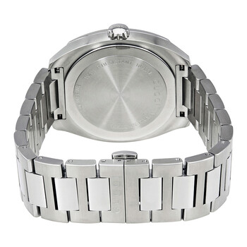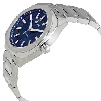 Stainless steel case with a stainless steel bracelet. Fixed stainless steel bezel. Blue dial with luminous silver-tone hands and index hour markers. Minute markers around the outer rim. Dial Type: Analog. Luminescent hands and markers. Date display at the 6 o'clock position. Quartz movement. Scratch resistant mineral crystal. Screw down crown. Solid case back. Cushion case shape. Case size: 41 mm. Case thickness: 8 mm. Band width: 23 mm. Band length: 9 inches. Fold over clasp with push button release. Water resistant at 100 meters / 330 feet. Functions: hour, minute, second. Casual watch style. Watch label: Swiss Made. Gucci GG2570 Blue Dial Men's Watch YA142303.