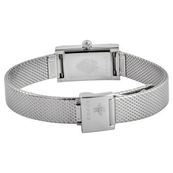 Stainless steel case with a stainless steel mesh bracelet. Fixed stainless steel bezel. Green, red and blue dial with silver-tone alpha-style hands. Index markers at the 3, 6, 9 and 12 o'clock positions. Dial Type: Analog. Quartz movement. Scratch resistant sapphire crystal. Pull / push crown. Solid case back. Rectangle case shape. Case dimensions: 14 mm x 25 mm. Case thickness: 7 mm. Band width: 10 mm. Fold over slip through clasp. Water resistant at 30 meters / 100 feet. Functions: hour, minute. Dress watch style. Watch label: Swiss Made. Gucci G-rame Quartz Green, Red and Blue Dial Ladies Watch YA147510.