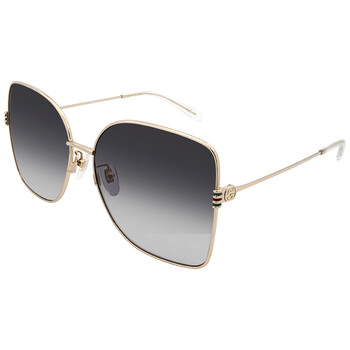 Gucci Sunglasses. Series number: GG1282SA. Color code: 002. Shape: Butterfly. Lens Width: 62 mm. Lens Bridge: 16 mm. Arm Length: 140 mm. 100% UV protection. Frame Material: Metal. Frame Color: Gold. Lenses Type: Grey. Rim Style: Full-Rim. UPC/EAN code: 889652412801. Gucci Grey Butterfly Ladies Sunglasses GG1282SA 002 62.