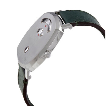 Stainless steel case with a green leather strap. Fixed stainless steel bezel. Silver dial with hours and minute displays. Dial Type: Analog. Date display at the 6 o'clock position. Quartz movement. Scratch resistant sapphire crystal. Pull / push crown. Solid case back. Cushion case shape. Case size: 35 mm. Tang clasp. Water resistant at 30 meters / 100 feet. Functions: date, hour, minute. Grip Series. Dress watch style. Watch label: Swiss Made. Gucci Grip Quartz Unisex Watch YA157412.