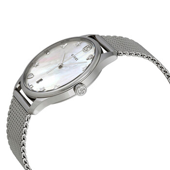Stainless steel case with a stainless steel mesh bracelet. Fixed stainless steel bezel. Mother of pearl dial with silver-tone hands and index hour markers. Dial Type: Analog. Date display above the 6 o'clock position. Quartz movement. Scratch resistant sapphire crystal. Pull / push crown. Solid case back. Round case shape. Case size: 36 mm. Band width: 20 mm. Deployment clasp. Water resistant at 50 meters / 165 feet. Functions: date, hour, minute, second. Additional Info: Styled with iconic Gucci trademark inderx markers: the bee, star, triangle and heart. Dress watch style. Watch label: Swiss Made. Gucci G-Timeless Mother of Pearl Dial Ladies Watch YA1264040.