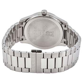 Stainless steel case with a stainless steel bracelet. Fixed stainless steel bezel. Silver (bee motif) dial with silver-tone hands and pyramid, star and bee hour markers. Dial Type: Analog. Quartz movement. Scratch resistant sapphire crystal. Pull / push crown. Solid case back. Round case shape. Case size: 38 mm. Fold over clasp with a safety release. Water resistant at 50 meters / 165 feet. Functions: hour, minute, second. G-timeless Series. Dress watch style. Watch label: Swiss Made. Gucci G-Timeless Quartz Silver Dial Ladies Watch YA1264126.