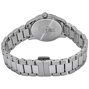 Stainless steel case with a stainless steel bracelet. Fixed stainless steel bezel. Silver (feline head) dial with silver-tone hands and Gucci charms hour markers. Dial Type: Analog. Quartz movement. Scratch resistant sapphire crystal. Pull / push crown. Solid case back. Round case shape. Case size: 27 mm. Case thickness: 8 mm. Fold over clasp with a push button release. Water resistant at 50 meters / 165 feet. Functions: hour, minute, second. Additional Info: house motifs: bee, star, square (pyramid), heart hour. G-timeless Series. Dress watch style. Watch label: Swiss Made. Gucci G-Timeless Silver Dial Ladies Watch YA126595.