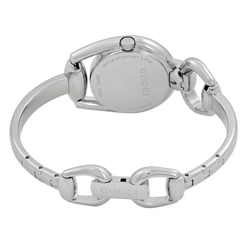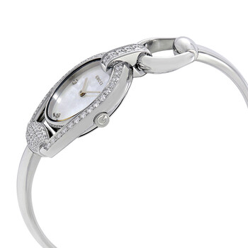 Silver-tone stainless steel- diamond set case with a silver-tone stainless steel bracelet. Fixed- diamond set stainless steel bezel. Mother of pearl dial with silver-tone hands and diamonds hour markers. Dial Type: Analog. Quartz movement. Scratch resistant sapphire crystal. Solid case back. Unique case shape. Case size: 28 mm. Water resistant at 50 meters / 165 feet. Functions: hour, minute. Luxury watch style. Watch label: Swiss Made. Gucci Horsebit Mother of Pearl Diamond Dial Ladies Bangle Watch YA139505.