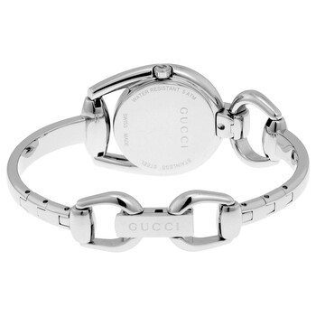 Stainless steel case with a stainless steel bangle bracelet. Diamond set lug. Fixed stainless steel bezel. White mother of pearl dial with silver-tone hands. Roman numerals mark the 6 and 12 o'clock positions. The Gucci name appears at the 3 o'clock position. Dial Type: Analog. Quartz movement. Scratch resistant sapphire crystal. Pull / push crown. Solid case back. Case size: 28 mm. Case thickness: 6.5 mm. Round case shape. Band width: 6 mm. Band length: 7 inches. Jewelry clasp. Water resistant at 50 meters / 165 feet. Functions: hour, minute. Luxury watch style. Watch label: Swiss Made. Gucci Horsebit Small Whte Mother of Pearl Dial Ladies Watch YA139504.