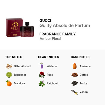 Belonging to the Amber Floral fragrance family, Guilty Absolu de Parfum opens with a radiant mix of bitter almond, bergamot, and mandora, offering a fresh yet daring first impression. The heart reveals a romantic blend of wisteria, rose, and patchouli, creating a soft yet confident floral core that lingers beautifully on the skin.
