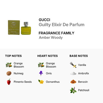 Guilty Elixir De Parfum opens with enticing top notes of orange blossom, nutmeg, and pimento seeds, creating a fresh yet spicy introduction. As the scent develops, heart notes of more orange blossom, orris, and osmanthus emerge, adding a layer of floral sophistication. The base notes of vanilla, Ambrofix, benzoin, and patchouli round out the fragrance with a warm, woody finish that lingers on the skin.