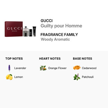 This exclusive Gucci Guilty pour Homme Gift Set includes a 3.0 oz Eau de Toilette Spray, a 1.7 oz Shower Gel, and a 2.5 oz Deodorant Stick. Perfectly packaged for gifting or personal indulgence, it’s a complete grooming experience that keeps you feeling fresh and smelling incredible all day. With its luxurious design and bold aroma, this set is an essential for any man who isn't afraid to embrace his true self.