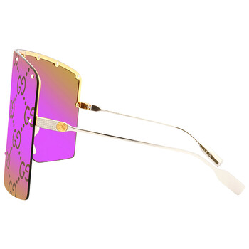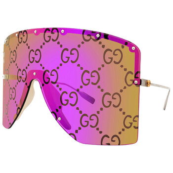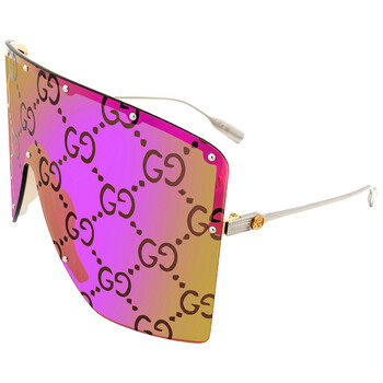 Gucci Sunglasses. Series number: GG1244S. Color code: 002. Shape: Shield. Lens Width: 99 mm. Lens Height: 84 mm. Lens Bridge: 1 mm. Arm Length: 125 mm. 100% UV protection. Frame Material: Metal. Frame Color: Gold/Silver. Lenses Type: Pink Mirror. Rim Style: Rimless. UPC/EAN code: 889652398235. Gucci Pink Mirror Shield Unisex Sunglasses GG1244S 002 99.