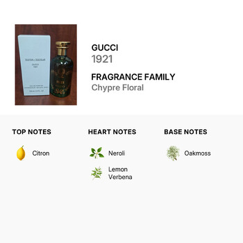 Gucci 1921 opens with a bright burst of citron, creating a fresh and invigorating start that instantly awakens the senses. As the scent unfolds, heart notes of neroli and lemon verbena add a crisp, floral layer—delicate yet full of character. Finally, the base settles into a rich oakmoss finish, grounding the fragrance with a smooth, natural depth that lingers beautifully on the skin.