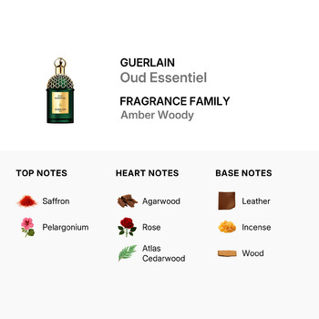 Guerlain's Oud Essentiel opens with an intriguing burst of saffron and pelargonium, setting the stage for an unforgettable olfactory journey. At its heart, the fragrance reveals the opulence of agarwood, elegantly paired with the delicate essence of rose and the robust notes of Atlas cedarwood. This exquisite combination leads to a warm and inviting base of leather, incense, and wood, creating a perfect harmony within the Amber Woody family.