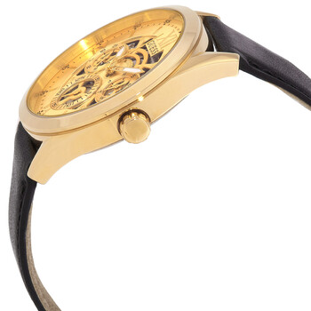 Stainless steel case, Leather strap, Gold dial, Quartz movement, Scratch resistant mineral, Water resistant up 3 ATM - 30 meters - 100 feet