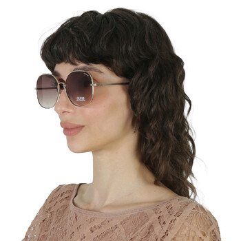Guess Factory Sunglasses. Series number: GF0385. Color code: 32F. Shape: Butterfly. Lens Width: 61 mm. Lens Bridge: 16 mm. Arm Length: 145 mm. 100% UV protection. Non-Polarized. Frame Material: Metal. Frame Color: Gold. Lenses Type: Brown Gradient. Rim Style: Full-Rim. UPC/EAN code: 889214284266. Guess Factory Brown Gradient Butterfly Ladies Sunglasses GF0385 32F 61.