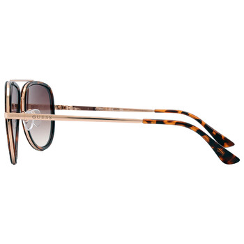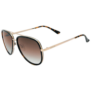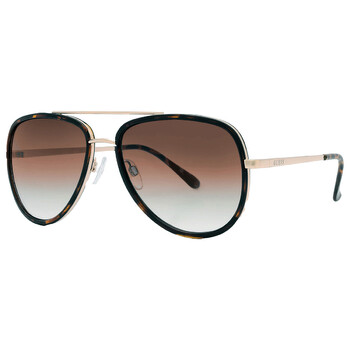 Guess Factory Sunglasses. Series number: GF0417. Color code: 52F. Shape: Pilot. Lens Width: 59 mm. Lens Bridge: 17 mm. Arm Length: 145 mm. 100% UV protection. Non-Polarized. Frame Material: Metal. Frame Color: Dark Havana. Lenses Type: Gradient Brown. Rim Style: Full-Rim. UPC/EAN code: 889214446817. Guess Factory Gradient Brown Pilot Ladies Sunglasses GF0417 52F 59.