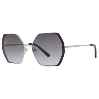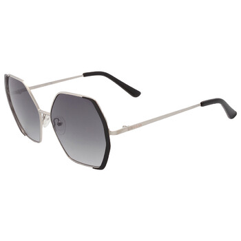 Guess Factory Sunglasses. Series number: GF0387. Color code: 10B. Shape: Geometric. Lens Width: 57 mm. Lens Bridge: 20 mm. Arm Length: 150 mm. 100% UV protection. Non-Polarized. Frame Material: Metal. Frame Color: Shiny Light Nickeltin. Lenses Type: Smoke Gradient. Rim Style: Full-Rim. UPC/EAN code: 889214287847. Guess Factory Smoke Gradient Geometric Ladies Sunglasses GF0387 10B 57.