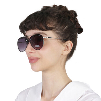 Guess Factory Sunglasses. Series number: GF0386. Color code: 10B. Shape: Pilot. Lens Width: 63 mm. Lens Bridge: 11 mm. Arm Length: 150 mm. 100% UV protection. Non-Polarized. Frame Material: Metal. Frame Color: Shiny Light Nickeltin. Lenses Type: Smoke Gradient. Rim Style: Full-Rim. UPC/EAN code: 889214287878. Guess Factory Smoke Gradient Pilot Ladies Sunglasses GF0386 10B 63.