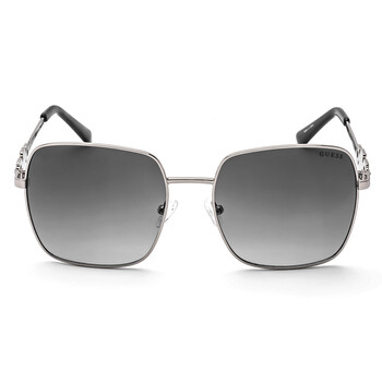 Guess Factory Sunglasses. Series number: GF6115. Color code: 10B. Shape: Rectangular. Lens Width: 57 mm. Lens Bridge: 19 mm. Arm Length: 139 mm. 100% UV protection. Non-Polarized. Frame Material: Metal. Frame Color: Shiny Light Nickeltin. Lenses Type: Smoke Gradient. Rim Style: Full-Rim. UPC/EAN code: 889214178244. Guess Factory Smoke Gradient Rectangular Ladies Sunglasses GF6115 10B 57.