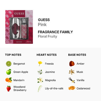Guess Pink belongs to the Floral Fruity family, a symphony of scents that evoke a sense of joy and sophistication. The top notes of bergamot, green apple, mandarin, and woodland strawberry create a fresh and vibrant opening, capturing your senses with their lively and refreshing essence.