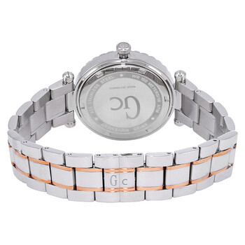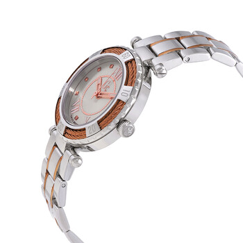 Stainless steel case with a two-tone (silver-tone and rose gold-tone) stainless steel bracelet. Fixed stainless steel bezel with rose gold-tone accents with silver-tone cable wire inlays. Silver dial with luminous rose gold-tone hands and pryamid hour markers. Roman numerals appear at the 5, 7 and 12 o'clock positions. Dial Type: Analog. Quartz movement. Scratch resistant mineral crystal. Pull / push crown. Solid case back. Round case shape. Case size: 34 mm. Case thickness: 9.2 mm. Band width: 17 mm. Deployment clasp. Water resistant at 100 meters / 330 feet. Functions: hour, minute, second. Ladydiver Cable Series. Casual watch style. Watch label: Swiss Made. Guess LadyDiver Cable Quartz Silver Dial Ladies Watch Y41003L1.