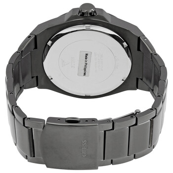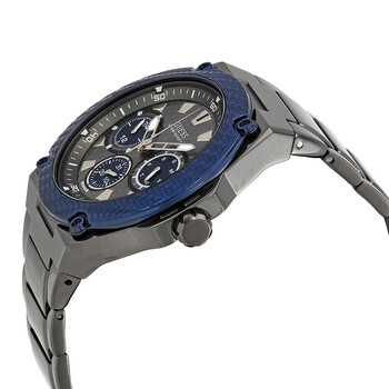 Gunmetal stainless steel case with a gunmetal stainless steel bracelet. Fixed blue bezel. Gunmetal dial with silver-tone hands and index hour markers. Minute markers around the outer rim. Dial Type: Analog. Luminescent hands. Date display at the 6 o'clock position. Quartz movement. Scratch resistant mineral crystal. Pull / push crown. Solid case back. Round case shape, case size: 45 mm, case thickness: 11 mm. Buckle clasp. Water resistant at 100 meters / 330 feet. Functions: date, day, GMT, second time zone, hour, minute, second. Casual watch style. Watch label: Japan Movt. Guess Legacy Quartz Men's Multifunction Watch W1305G3.