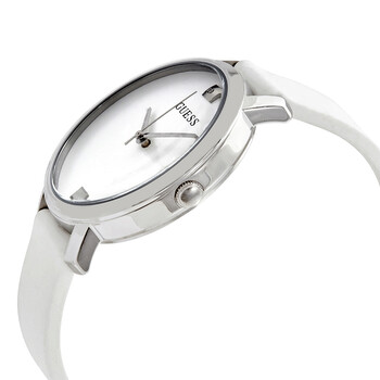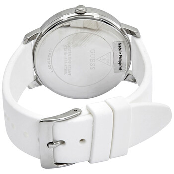 Stainless steel case with a white rubber strap. Fixed stainless steel bezel. Silver dial with silver-tone hands. A single diamond is set at the 12 o'clock position. Dial Type: Analog. Quartz movement. Scratch resistant mineral crystal. Pull / push crown. Solid case back. Round case shape. Case size: 40 mm. Case thickness: 9 mm. Band width: 18 mm. Tang clasp. Water resistant at 30 meters / 100 feet. Functions: hour, minute, second. Casual watch style. Guess Nova Quartz Silver Dial White Rubber Ladies Watch W1210L1.