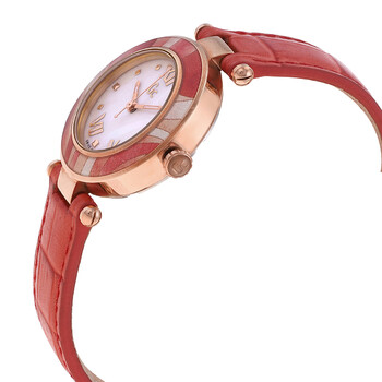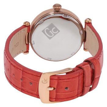 Rose gold-tone stainless steel case with a red leather strap. Fixed gold-tone bezel with an inlaid red tonal ring. Mother of pearl dial with rose gold-tone hands and index hour markers. Roman numeral markers at the 5, 7 and 12 o'clock positions. Dial Type: Analog. Quartz movement. Scratch resistant mineral crystal. Pull / push crown. Solid case back. Round case shape, case size: 32 mm, case thickness: 9 mm. Band width: 16 mm. Tang clasp. Water resistant at 30 meters / 100 feet. Functions: hour, minute, second. Casual watch style. Watch label: Swiss Mvt. Guess Quartz Mother of Pearl Dial Ladies Watch Y12006L1.