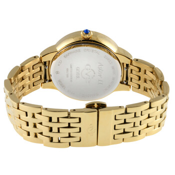 Yellow gold-tone stainless steel case and bracelet. Fixed yellow gold-tone stainless steel bezel. Mother of pearl dial with yellow gold-tone hands and Roman numeral hour markers. Dial Type: Analog. Luminescent hands. Quartz movement. Scratch resistant sapphire crystal. Pull / push crown. Solid case back. Round case shape, case size: 38 mm, case thickness: 10 mm. Band width: 18 mm. Deployment with push button release clasp. Water resistant at 30 meters / 100 feet. Functions: hour, minute, second. Additional Info: 4 diamonds. Astor II Series. Fashion watch style. GV2 by Gevril Astor II Quartz Ladies Watch 9144.