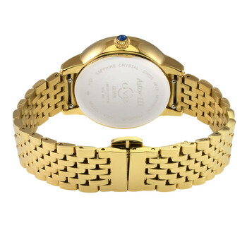 Yellow gold-tone stainless steel case and bracelet. Fixed yellow gold-tone stainless steel bezel. Mother of pearl dial with yellow gold-tone hands and Roman numeral hour markers. Dial Type: Analog. Ronda Caliber 763 quartz movement. Scratch resistant sapphire crystal. Pull / push crown. Solid case back. Round case shape, case size: 34 mm, case thickness: 8 mm. Band width: 14 mm, band length: 7.5 inches. Deployment with push button release clasp. Water resistant at 50 meters / 165 feet. Functions: hour, minute, second. Astor IIi Series. Fashion watch style. Watch label: Swiss Movt. GV2 by Gevril Astor Iii Quartz Ladies Watch 9153B.