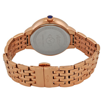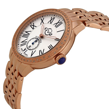 Rose gold-tone stainless steel case and bracelet. Fixed rose gold-tone bezel set with 50 diamonds. Silver dial with silver-tone hands and black Roman numeral hour markers. Minute markers around the outer rim. Dial Type: Analog. Seconds sub-dial above the 6 o'clock position. Quartz movement. Scratch resistant mineral crystal. Pull / push crown. Solid case back. Case diameter: 40 mm. Case thickness: 9.5 mm. Round case shape. Deployment with push button clasp. Water resistant at 30 meters / 100 feet. Functions: hour, minute, second. Additional Info: interchangeable white leather strap; limited edition -. Dress watch style. Watch label: Swiss Made. GV2 by Gevril Astor Rose Gold-tone Diamond Bezel Quartz Ladies Watch 9102.