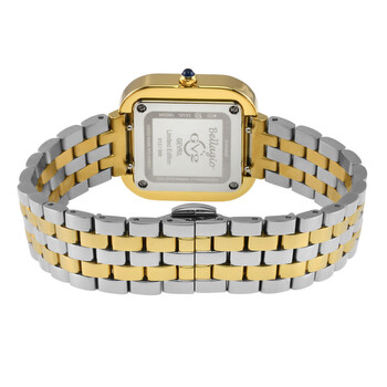 Yellow gold-tone stainless steel case with a two-tone (silver-tone and yellow gold-tone) stainless steel bracelet. Fixed yellow gold-tone stainless steel bezel. White dial with black hands and Roman numeral hour markers. Minute scale around the inner rim. Dial Type: Analog. Quartz movement. Scratch resistant sapphire crystal. Pull / push crown. Solid case back. Square case shape, case size: 30 mm, case thickness: 8.5 mm. Band width: 16 mm. Deployment with push button release clasp. Water resistant at 50 meters / 165 feet. Functions: hour, minute. Additional Info: 8 diamonds. Bellagio Series. Fashion watch style. GV2 by Gevril Bellagio Quartz White Dial Ladies Watch 12133B.