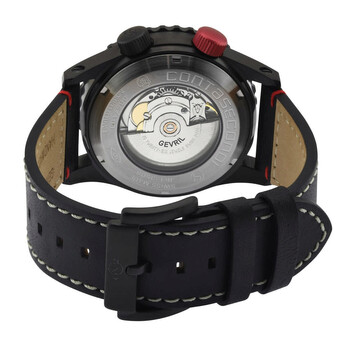 Black stainless steel case with a black genuine leather strap. Uni-directional rotating red stainless steel bezel. Silver-tone dial with silver-tone hands and Arabic numeral & index hour markers. Minute markers around the outer rim. Dial Type: Analog. Date display at the 6 o'clock position. Sellita Caliber SW200-1 Automatic movement, containing 26 Jewels, bitting at 28800 vph, and has a power reserve of approximately 38 hours. Scratch resistant sapphire crystal. Pull / push crown. Transparent case back. Round case shape, case size: 43 mm, case thickness: 14 mm. Band width: 22.5 mm, band length: 8.5 inches. Buckle clasp. Water resistant at 50 meters / 165 feet. Functions: date, hour, minute, second. Contasecondi Series. Luxury watch style. Watch label: Swiss Made. GV2 by Gevril Contasecondi Automatic Silver Dial Men's Watch 3508S.