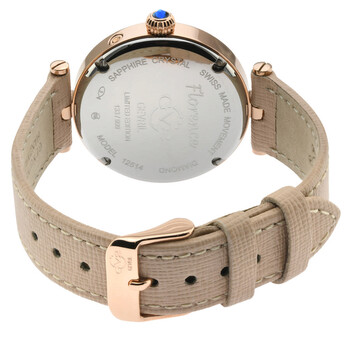 Rose gold-tone stainless steel case with a tan leather strap. Fixed rose gold-tone stainless steel bezel. Mother of pearl dial with rose gold-tone hands and Roman numeral hour markers. Diamond set at the 12 o'clock position. Arabic numeral minute markers (at 5 minute intervals). Minute markers around the outer rim. Dial Type: Analog. Date display at the 3 o'clock position. Three sub-dials displaying: date, day of the week and moonphase. Ronda Caliber 706.1 quartz movement. Scratch resistant sapphire crystal. Pull / push crown. Solid case back. Round case shape, case size: 36 mm, case thickness: 12 mm. Band width: 18 mm. Tang clasp. Water resistant at 50 meters / 165 feet. Functions: moon phase, date, day, hour, minute, second. Additional Info: day and date subdial with moon phase subdial. Florence Series. Fashion watch style. Watch label: Swiss Movt. GV2 by Gevril Florence Diamond Quartz Ladies Watch 12514.L.