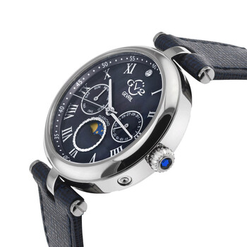 Silver-tone stainless steel case with a blue genuine leather strap. Fixed silver-tone stainless steel bezel. Mother of pearl dial with silver-tone hands and Roman numeral hour markers. Minute markers around the outer rim. Dial Type: Analog. Quartz movement. Scratch resistant sapphire crystal. Pull / push crown. Solid case back. Round case shape, case size: 36 mm, case thickness: 12 mm. Band width: 18 mm. Buckle clasp. Water resistant at 50 meters / 165 feet. Functions: date, day, hour, minute, second. Additional Info: day and date subdial with moon phase subdial. Florence Series. Fashion watch style. GV2 by Gevril Florence Quartz Ladies Watch 12512.L.