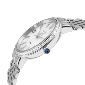 Stainless steel case with a stainless steel bracelet. Fixed stainless steel bezel set with crystals. Mother of pearl dial with silver-tone hands and diamond-set index hour markers. Roman numerals appear at the 3, 6, 9 and 12 o'clock positions. Dial Type: Analog. Quartz movement. Scratch resistant sapphire crystal. Pull / push crown. Solid case back. Round case shape. Case size: 36 mm. Case thickness: 8 mm. Band width: 18 mm. Fold over clasp with a push button release. Water resistant at 50 meters / 165 feet. Functions: hour, minute, second. Genoa Series. Fashion watch style. GV2 by Gevril Genoa Diamond Mother of Pearl Dial Ladies Watch 12530.