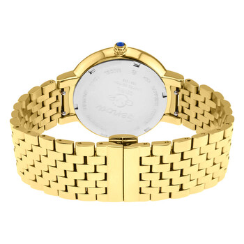 Yellow gold-tone stainless steel case and bracelet. Fixed yellow gold-tone stainless steel bezel. Mother of pearl dial with yellow gold-tone hands and Roman numeral hour markers. Dial Type: Analog. Date display at the 6 o'clock position. One subdial displaying: moonphase. Ronda Caliber 708 quartz movement. Scratch resistant sapphire crystal. Pull / push crown. Solid case back. Round case shape, case size: 37 mm, case thickness: 9 mm. Band width: 18 mm. Deployment with push button release clasp. Water resistant at 50 meters / 165 feet. Functions: moon phase, date, hour, minute, second, battery eol indicator. Genoa Series. Fashion watch style. Watch label: Swiss Movt. GV2 by Gevril Genoa Mother of Pearl Dial Quartz Diamond Ladies Watch 12544B.