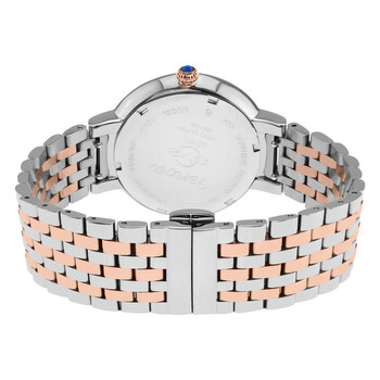 Silver-tone stainless steel case with a two-tone (silver-tone and rose gold-tone) stainless steel bracelet. Fixed silver-tone stainless steel bezel. Mother of pearl dial with rose gold-tone hands and diamond hour markers. Dial Type: Analog. Date display at the 6 o'clock position. One subdial displaying: moonphase. Ronda Caliber 708 quartz movement. Scratch resistant sapphire crystal. Pull / push crown. Solid case back. Round case shape, case size: 37 mm, case thickness: 9 mm. Band width: 18 mm. Deployment with push button release clasp. Water resistant at 50 meters / 165 feet. Functions: moon phase, date, hour, minute, second, battery eol indicator. Genoa Series. Fashion watch style. Watch label: Swiss Movt. GV2 by Gevril Genoa Mother of Pearl Dial Quartz Moon Phase Diamond Ladies Watch 12549B.