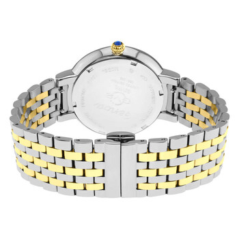 Silver-tone stainless steel case with a two-tone (silver-tone and yellow gold-tone) stainless steel bracelet. Fixed silver-tone stainless steel bezel. Mother of pearl dial with yellow gold-tone hands and Roman numeral hour markers. Dial Type: Analog. Date display at the 6 o'clock position. One subdial displaying: moonphase. Ronda Caliber 708 quartz movement. Scratch resistant sapphire crystal. Pull / push crown. Solid case back. Round case shape, case size: 37 mm, case thickness: 9 mm. Band width: 18 mm. Deployment with push button release clasp. Water resistant at 50 meters / 165 feet. Functions: moon phase, date, hour, minute, second, battery eol indicator. Genoa Series. Fashion watch style. Watch label: Swiss Movt. GV2 by Gevril Genoa Mother of Pearl Dial Quartz Moon Phase Ladies Watch 12545B.
