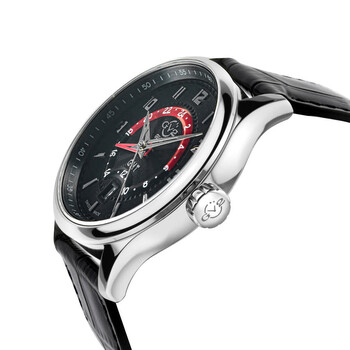 Stainless steel case with a black leather strap. Fixed stainless steel bezel. Black dial with silver-tone dauphine-style skeleton hands and Arabic numeral and index hour markers. 24 hour (GMT) markers. Arabic numeral minute markers (at 5 minute intervals). Minute markers around the outer rim. Dial Type: Analog. Date display at the 6 o'clock position. Quartz movement. Scratch resistant sapphire crystal. Pull / push crown. Solid case back. Round case shape. Case size: 42 mm. Case thickness: 12 mm. Band width: 20 mm. Deployment clasp with a push button release. Water resistant at 50 meters / 165 feet. Functions: GMT, second time zone, date, hour, minute, second. Giromondo Series. Fashion watch style. Watch label: Swiss Made. GV2 by Gevril Giromondo Quartz Black Dial Men's Watch 42303.