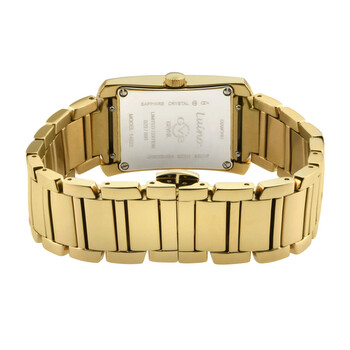 Yellow gold-tone stainless steel case and bracelet. Fixed yellow gold-tone stainless steel bezel. Mother of pearl dial with yellow gold-tone hands and diamond hour markers. Dial Type: Analog. Quartz movement. Scratch resistant sapphire crystal. Pull / push crown. Solid case back. Rectangle case shape, case size: 29 mm, case thickness: 9 mm. Band width: 18 mm. Deployment with push button release clasp. Water resistant at 50 meters / 165 feet. Functions: hour, minute. Additional Info: 12 diamonds. Luino Series. Fashion watch style. GV2 by Gevril Luino Diamond Mother of Pearl Dial Ladies Watch 14602B.