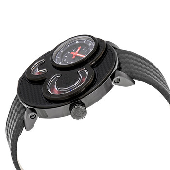 Black-plated stainless steel case with a black leather strap. Fixed black-plated bezel. Black dial with luminous red hands and Arabic numeral hour markers. Minute markers around the outer rim. Dial Type: Analog. Luminescent hands. Two displays showing: 24 hours (GMT) and 60 seconds. Ronda caliber 751, 505.24, 753 quartz movement. Scratch resistant anti-reflective sapphire crystal. Solid case back. Round case shape. Case size: 47 mm. Case thickness: 9.5 mm. Band width: 21.5 mm. Band length: 8.5 inches. Deployment clasp. Water resistant at 30 meters / 100 feet. Functions: GMT, second time zone, hour, minute, second. Macchina Del Tempo Series. Casual watch style. Watch label: Swiss Made. GV2 by Gevril Macchina Del Tempo Black Dial GMT Men's Watch 8305.