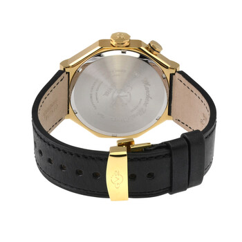 Yellow gold-tone stainless steel case with a black leather strap. Fixed yellow gold-tone stainless steel bezel. Black dial with yellow gold-tone hands and Arabic numeral hour markers. Dial Type: Analog. Luminescent hands. Ronda Caliber 515.24D quartz movement. Scratch resistant sapphire crystal. Pull / push crown. Solid case back. Octagon case shape, case size: 44 mm, case thickness: 13.8 mm. Band width: 20 mm. Deployment with push button release clasp. Water resistant at 50 meters / 165 feet. Functions: second time zone, hour, minute, second. Marchese Series. Fashion watch style. Watch label: Swiss Made. GV2 by Gevril Marchese Quartz Black Dial Men's Watch 42433.