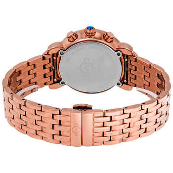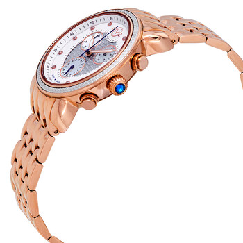 Rose gold-tone stainless steel case and bracelet. Fixed rose gold-tone bezel set with Swarovski crystals. White mother of peal (Swarovski crystal-set) dial with luminous rose gold-tone hands and diamond hour markers. Minute markers around the outer rim. Dial Type: Analog. Luminescent hands. Date display at the 6 o'clock position. Chronograph - three sub-dials displaying: 60 second, 30 minute and date. ISA caliber 8171/202 quartz movement. Scratch resistant anti-reflective sapphire crystal. Solid case back. Round case shape. Case size: 37 mm. Case thickness: 9 mm. Bracelet width: 18 mm. Band length: 7.5 inches. Deployment clasp with a push button release. Water resistant at 30 meters / 100 feet. Functions: chronograph, date, hour, minute, second. Additional Info: in general, withstands splashes or brief immersion in water, but not suitable for swimming or bathing. Sport watch style. Watch label: Swiss Made. GV2 by Gevril Marsala Chronograph Diamond Crystal Ladies Watch 9881.