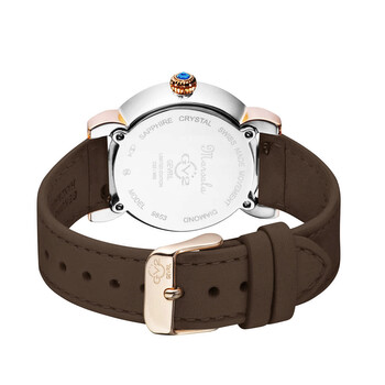 Rose gold-tone stainless steel case with a brown leather strap. Fixed stainless steel bezel with an inlaid tortoise-shell acetate ring. Brown dial with silver-tone hands and diamond hour markers. Roman numerals appear at the 3, 6 and 9 o'clock positions. Arabic numeral minute markers (at 5 minute intervals). Minute markers around the outer rim. Dial Type: Analog. Luminescent hands. Quartz movement. Scratch resistant sapphire crystal. Pull / push crown. Solid case back. Round case shape. Case size: 36 mm. Case thickness: 9.5 mm. Band width: 18 mm. Tang clasp. Water resistant at 30 meters / 100 feet. Functions: hour, minute, second. Additional Info: 9 diamonds. Marsala Tortoise Series. Fashion watch style. GV2 by Gevril Marsala Tortoise Diamond Brown Dial Ladies Watch 9855.