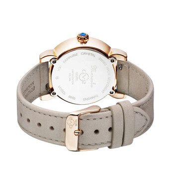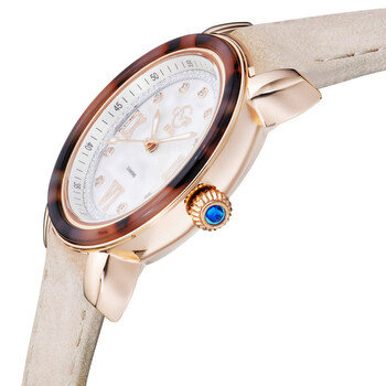 Rose gold-tone stainless steel case with a tan leather strap. Fixed rose gold-tone bezel with a tortoise-shell acetate inlay. Mother of pearl dial with rose gold-tone hands and diamond hour markers. Roman numerals appear at the 3, 6 and 9 o'clock positions. Arabic numeral minute markers (at 5 minute intervals). Minute markers around the outer rim. Dial Type: Analog. Luminescent hands. Quartz movement. Scratch resistant sapphire crystal. Pull / push crown. Solid case back. Round case shape. Case size: 36 mm. Case thickness: 9.5 mm. Band width: 18 mm. Tang clasp. Water resistant at 30 meters / 100 feet. Functions: hour, minute, second. Additional Info: 9 diamonds. Marsala Tortoise Series. Fashion watch style. GV2 by Gevril Marsala Tortoise Diamond Mother of Pearl Dial Ladies Watch 9853.
