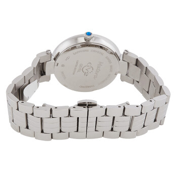 Silver-tone stainless steel case and bracelet. Fixed silver-tone stainless steel bezel. Mother of pearl dial with silver-tone hands and diamond hour markers. Minute markers around the outer rim. Dial Type: Analog. Ronda Caliber 762 quartz movement. Scratch resistant sapphire crystal. Pull / push crown. Solid case back. Round case shape, case size: 35 mm, case thickness: 8.5 mm. Band width: 18 mm. Deployment with push button release clasp. Water resistant at 50 meters / 165 feet. Functions: hour, minute. Additional Info: 8 diamonds and 22 gemstones. Matera Series. Fashion watch style. Watch label: Swiss Movt. GV2 by Gevril Matera Diamond Mother of Pearl Dial Ladies Watch 12800B.