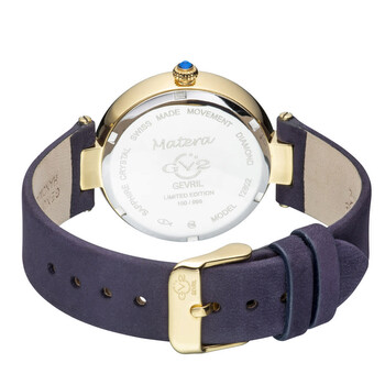 Yellow gold-tone stainless steel case with a blue leather strap. Fixed (diamond-cut) yellow gold-tone bezel. Blue gem set lugs. Mother of pearl (mosaic) dial with yellow gold-tone hands and diamond hour markers. Blue gems set at the 3, 6, 9 and 12 o'clock positions. Arabic numeral minute markers (at 5 minute intervals). Minute markers around the outer rim. Dial Type: Analog. Ronda 762 quartz movement. Scratch resistant sapphire crystal. Pull / push crown. Solid case back. Round case shape. Case size: 35 mm. Case thickness: 8.5 mm. Band width: 18 mm. Tang clasp. Water resistant at 50 meters / 165 feet. Functions: hour, minute. Matera Series. Luxury watch style. Watch label: Swiss Quartz. GV2 by Gevril Matera Diamond Mother of Pearl Dial Ladies Watch 12802.