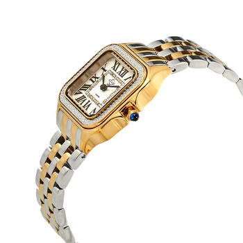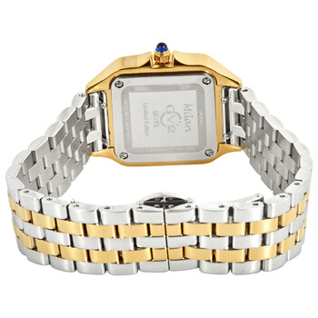 Yellow gold-tone stainless steel case with a two-tone (silver-tone and yellow gold-tone) stainless steel bracelet. Fixed yellow gold-tone bezel. White dial with black hands and Roman numeral hour markers. Minute scale around the inner rim. Dial Type: Analog. Ronda caliber 762 quartz movement. Scratch resistant sapphire crystal. Pull / push crown. Solid case back. Square case shape. Case size: 27.5 mm. Case thickness: 9 mm. Band width: 16 mm. Deployment clasp with a push button release. Water resistant at 50 meters / 165 feet. Functions: hour, minute. Milan Series. Fashion watch style. Watch label: Swiss Movt. GV2 by Gevril Milan Quartz White Dial Ladies Watch 12113B.